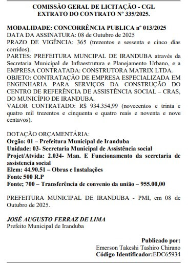 Um novo Centro de Referência de Assistência Social (CRAS) será construído no município de Iranduba, interior do Amazonas, ao custo de R$ 934.354,99. A contratação da Construtora Matrix Ltda foi publicada no Diário Oficial dos Municípios (DOM) desta quarta-feira (15).