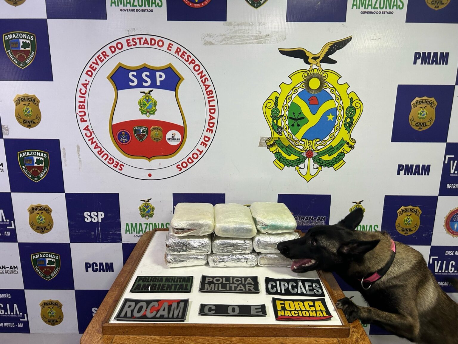 A droga foi localizada com o auxílio da cadela de faro para narcóticos Athena da PMAM