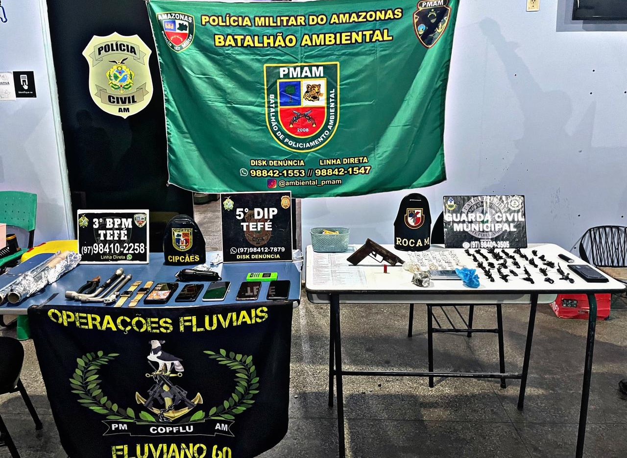 Uma ação realizada por policiais da Base Fluvial Tiradentes, em conjunto com o 5º Distrito Regional de Polícia Civil (DRPC) e o 5° Batalhão da Polícia Militar do Amazonas (BPM), resultou na prisão de quatro pessoas, em Tefé (a 523 quilômetros de Manaus). Os presos são suspeitos de envolvimento em crimes de tráfico de drogas, porte ilegal de armas e associação criminosa.