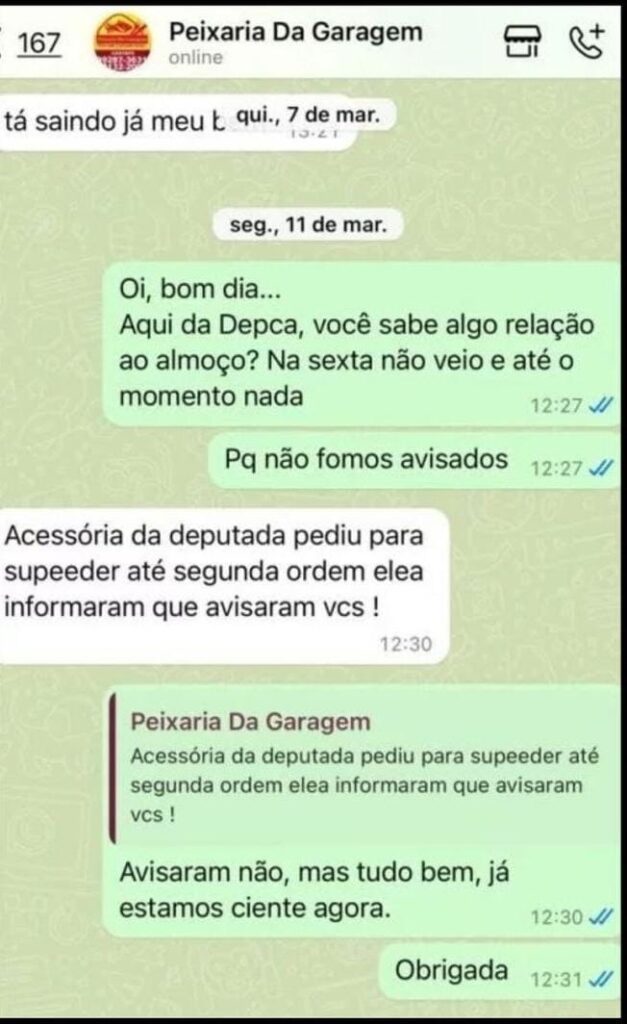 Conforme print revelado, a parlamentar teria suspendido a ajuda com alimentação que fornecia as vítimas da Depca.