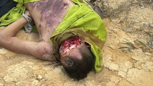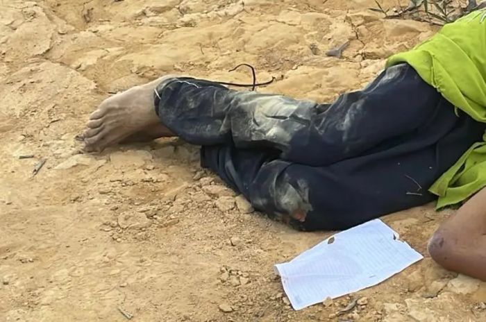 A vítima estava com as mãos e os pés amarrados, sem camisa, vestindo apenas uma calça preta e descalço. Além disso, apresentava cortes no nariz e em um dos olhos.