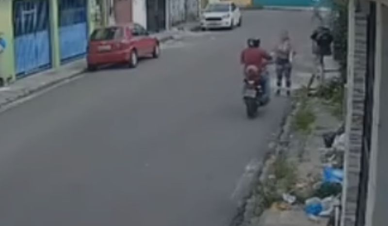 No vídeo, a mulher aparece caminhando tranquilamente pela rua quando é surpreendida por um homem em uma motocicleta, que trafegava no sentido contrário. O suspeito se aproxima, impede a passagem da vítima e anuncia o assalto.