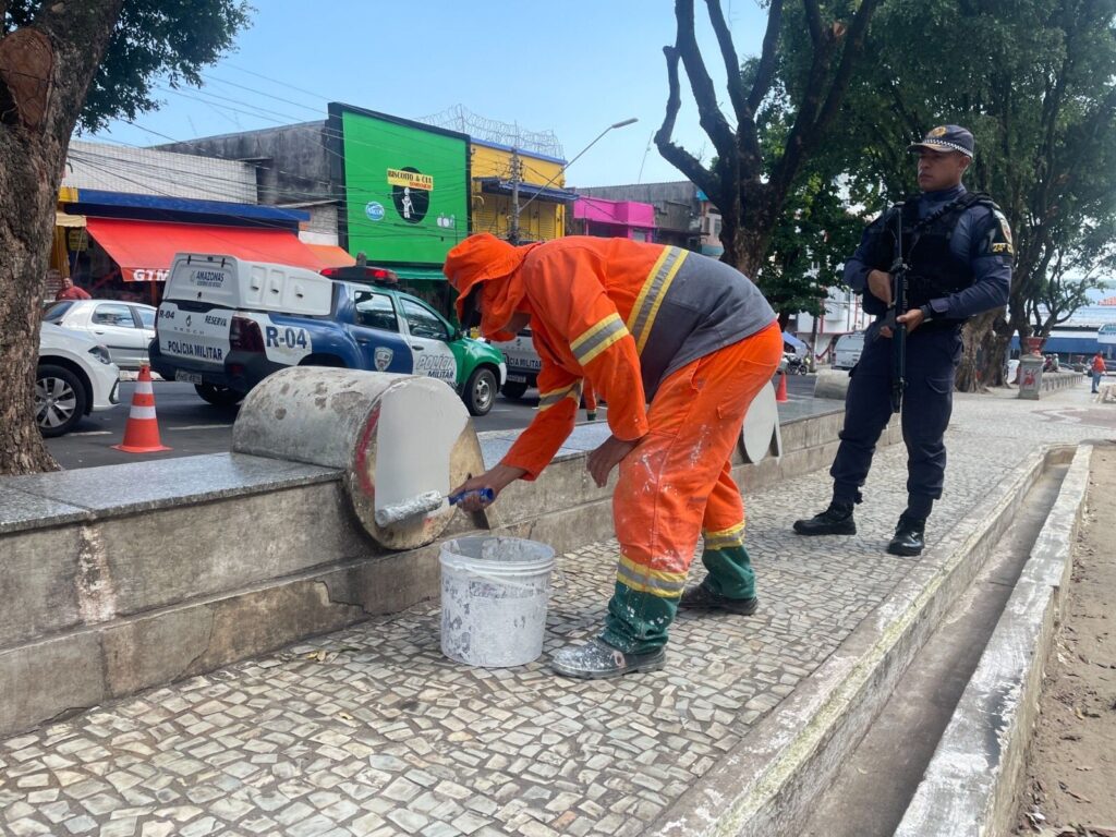 As praças dos Remédios e Francisco de Queiroz, no Centro de Manaus, receberam pintura nova e reforço no policiamento, nesta quinta-feira (22/02). A ação realizada pela Polícia Militar do Amazonas, por meio da 24ª Companhia Interativa Comunitária (Cicom) em conjunto com secretarias da Prefeitura de Manaus faz parte da operação Revitalização, coordenada pela Secretaria de Estado de Segurança Pública do Amazonas (SSP-AM).