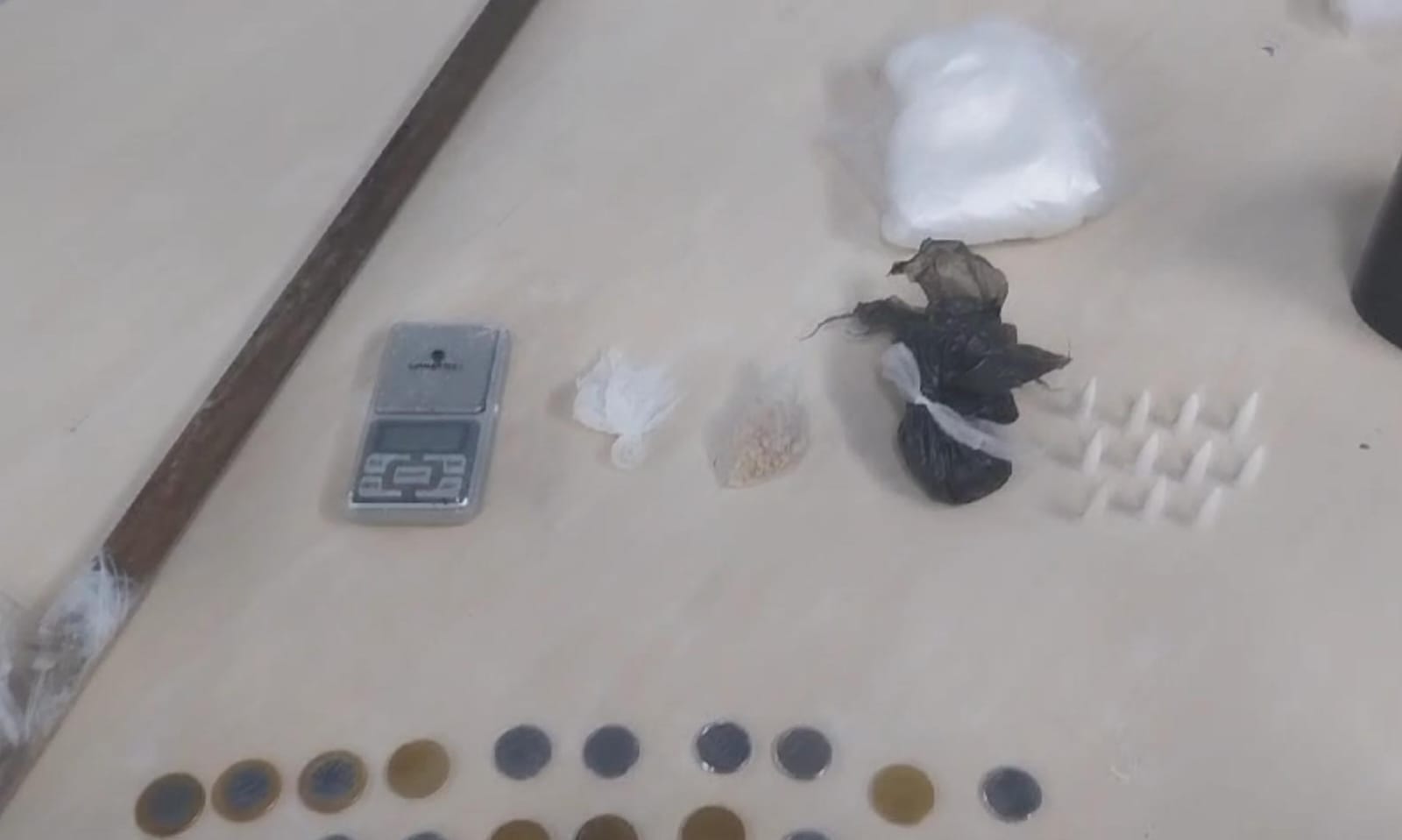 Materiais apresentados no DIP 13 gramas de oxi, 11 pinos de cocaína, 12 gramas de maconha, 1 balança de precisão, R$ 236,00