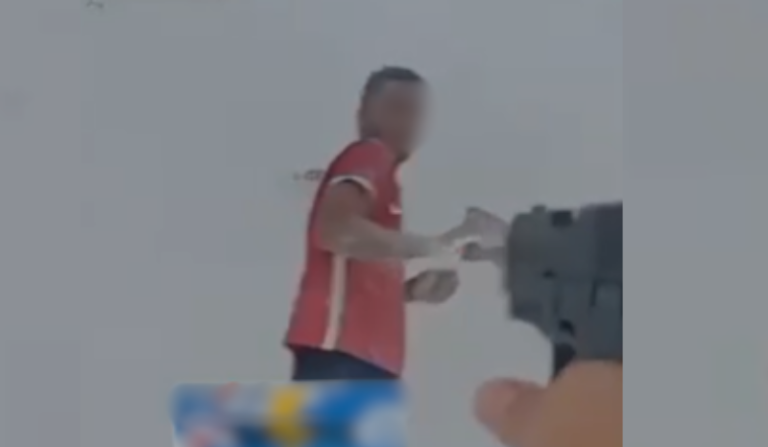 Um dos suspeitos aponta a arma na direção de Lucas e dispara várias vezes contra a vítima na região da cabeça. É possível perceber que o local ficou todo sujo de sangue.