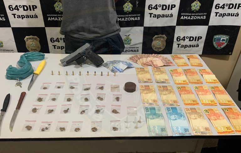 Tapauá (AM) – Um jovem de 21 anos foi preso pelos crimes de tráfico de entorpecentes e posse ilegal de arma de fogo durante operação policial no município de Tapauá, no interior do Amazonas, durante a quinta-feira (19). Ainda foram apreendidos de vários materiais ilícitos, resultando em um dano equivalente a R$ 4.820 mil ao crime.