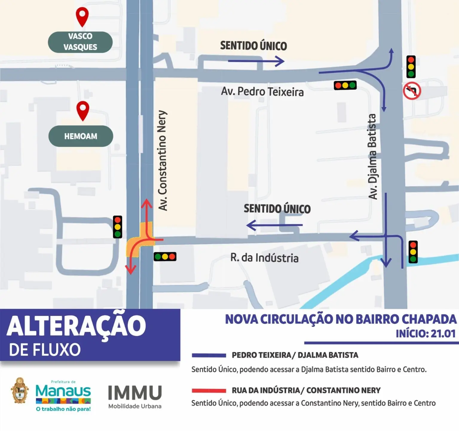 A avenida Pedro Teixeira, agora, opera em sentido único (sentido avenida Djalma Batista) no trecho entre as avenidas Constantino Nery e Djalma Batista. Essa reorganização elimina o contrafluxo, reduz os riscos de acidentes e garante uma circulação mais fluida e segura. De forma complementar, a rua da Indústria se tornou o acesso principal ao sentido contrário, conectando quem vem da avenida Djalma Batista para acessar a Constantino Nery. Com a abertura de novos canteiros centrais e a instalação de semáforos, os motoristas podem acessar essas vias, tanto no sentido bairro/Centro quanto no sentido oposto.