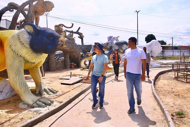 O prefeito explica que o Gigantes da Floresta será inaugurado em duas etapas, a primeira referente à praça molhada, onde tem esculturas de peixes dos rios amazônicos, e a segunda, sendo a área dos demais animais da fauna, como répteis, felinos e primatas.