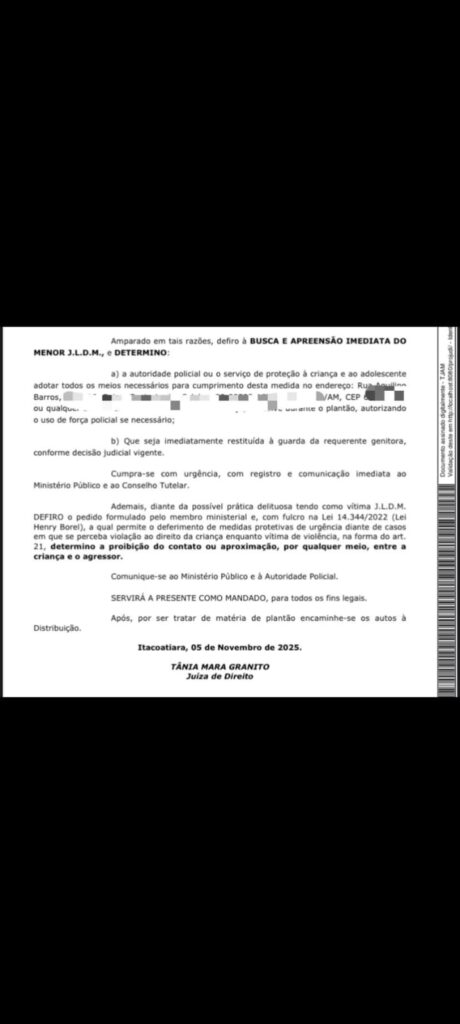Após análise dos fatos, a Justiça determinou, nesta data, a busca e apreensão da criança, a fim de que retorne ao lar materno, garantindo sua segurança e bem-estar.