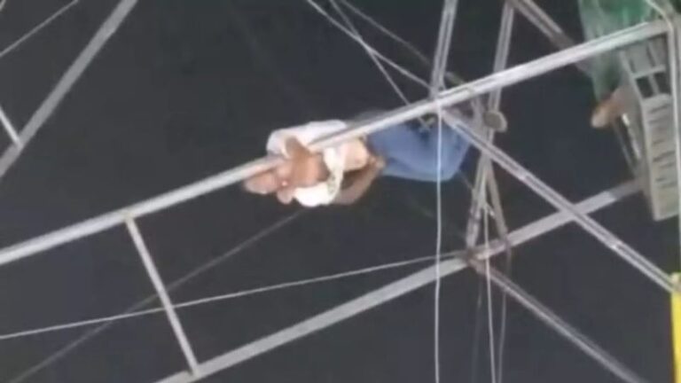Imagens mostram momento de pânico em evento; vítima se segura para evitar queda fatal.