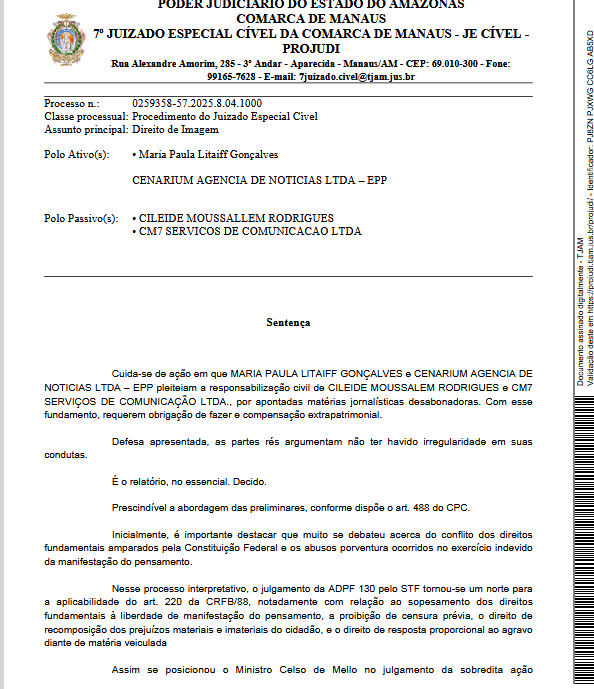 Amazonas – A Justiça do Amazonas não deixou margem para dúvida e julgou improcedente a ação movida por Paula Litaiff e pela Cenarium contra a jornalista Cileide Moussallem e o CM7. Na prática, a decisão confirmou que não houve dano moral, não houve abuso e não houve irregularidade nas matérias publicadas.