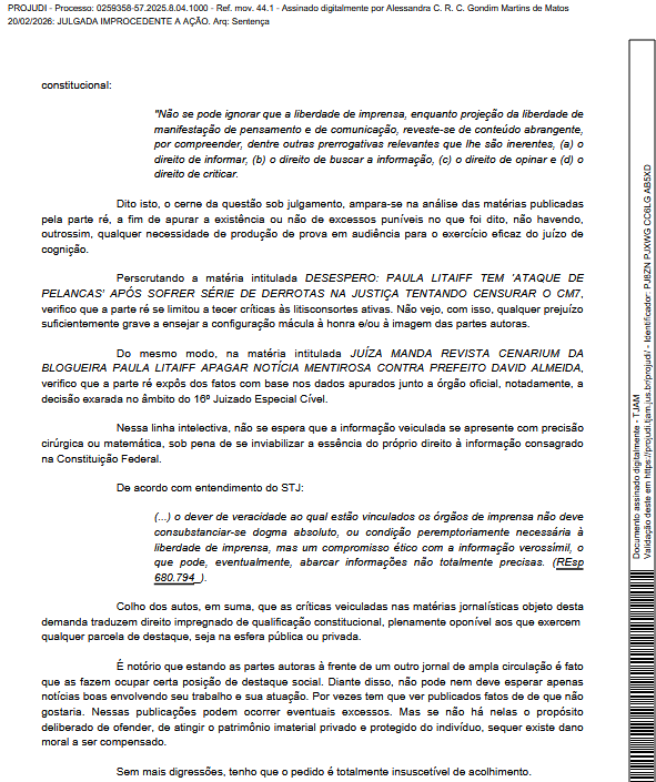 Na sentença, a juíza foi clara ao afirmar que o conteúdo questionado está protegido pela liberdade de imprensa, direito constitucional que garante informar, opinar e criticar, especialmente quando se trata de pessoas com atuação pública e à frente de veículos de comunicação.