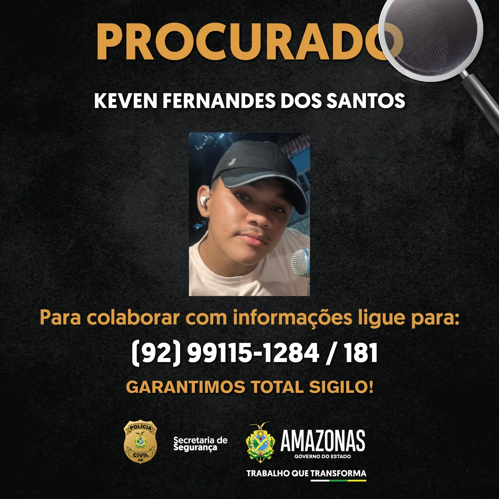 A Polícia Civil do Amazonas (PC-AM), por meio da Delegacia Especializada em Proteção à Criança e ao Adolescente (Depca), solicita ampla divulgação da imagem do cantor Keven Fernandes dos Santos, 19, procurado por estupro de vulnerável praticado contra uma adolescente de 12 anos.