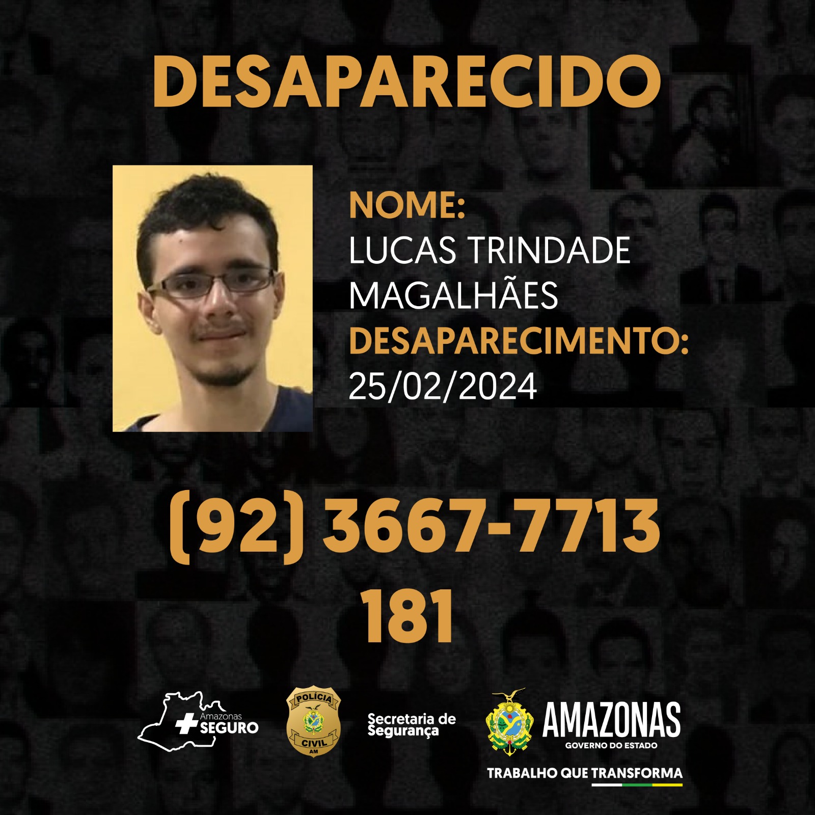 A PC-AM solicita a quem saiba a localização de Lucas Trindade Magalhães, que as informações sejam repassadas pelos números (92) 3667-7713, disque denúncia da Deops, ou pelo 181, da Secretaria de Estado de Segurança Pública (SSP-AM).