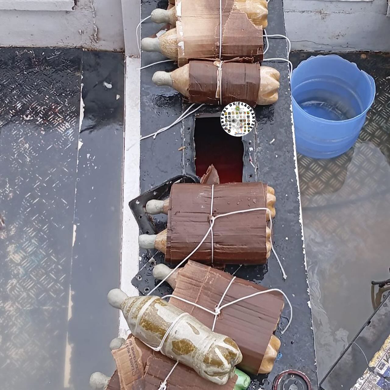 Durante a inspeção, os policiais perceberam que a lancha de apoio estava em um local incomum, afastada da embarcação principal, levantando suspeitas. Após a busca, várias garrafas PET contendo a droga foram descobertas.