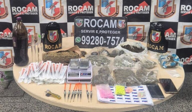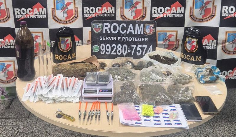 Entre o material apreendido estavam porções de maconha do tipo skunk, pacotes de substância semelhante ao haxixe, centenas de comprimidos de cores variadas, balanças de precisão, seringas de insulina — algumas delas preenchidas com líquido escuro —, além de frascos com substâncias líquidas, possivelmente THC. Também foram apreendidos dois celulares e a motocicleta usada pelos suspeitos.