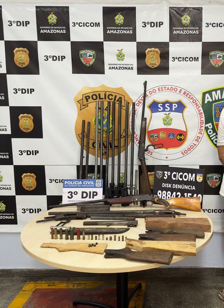 A Polícia Civil do Amazonas (PC-AM), por meio do 3º Distrito Integrado de Polícia (DIP), prendeu em flagrante, nesta segunda-feira (08/07), um indivíduo, cuja idade não foi revelada, apontado como dono de uma oficina clandestina de reparo de armas de fogo no bairro Petrópolis, zona sul da cidade.