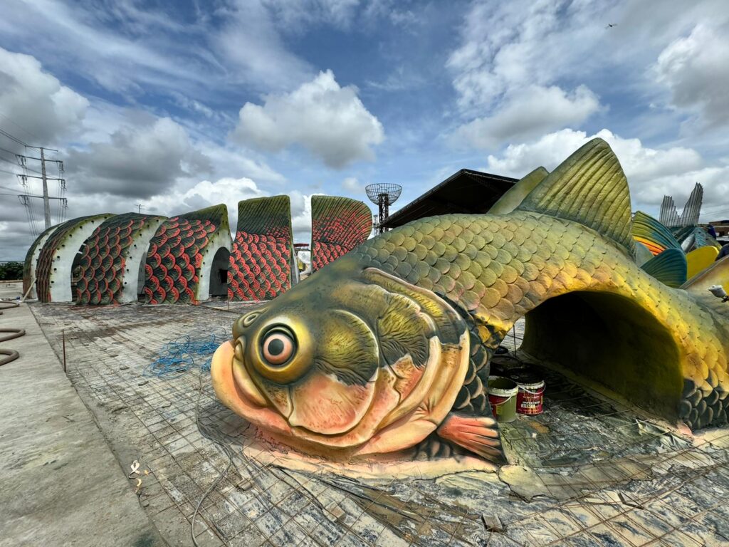 Outro avanço na segunda etapa no parque linear é no cenário amazônico. Os artistas trabalham nas armações de concreto, determinando os detalhes das esculturas, com suas escamas, curvas e características das espécies. Paralelamente, as equipes estão dando forma ao espelho d’água da área molhada.