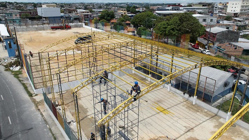 Ao lado do campo, é construída uma quadra coberta com 493 metros quadrados de área, onde a equipe trabalha na instalação da estrutura metálica. O próximo passo será construir quatro banheiros, sala administrativa e refazer a parte elétrica, hidráulica e a iluminação do campo e da quadra.