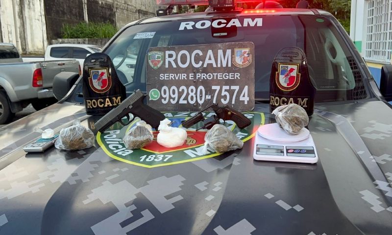 Manaus — Policiais da Ronda Ostensiva Cândido Mariano (ROCAM) apreenderam, na tarde desta terça-feira (4), quatro porções de maconha, duas armas de fogo e duas balanças de precisão em uma área conhecida como Beco do Bolt, no bairro da Compensa, zona oeste de Manaus.