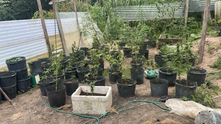Durante a revista pessoal, os policiais encontraram pequenas porções de maconha. Em seguida, a equipe fez uma varredura no local e localizou uma estufa com cerca de 50 pés de maconha, além de materiais usados no cultivo, como vasos, adubos e um caderno com anotações. No total, segundo a PM, mais de 60 mudas da planta foram apreendidas.