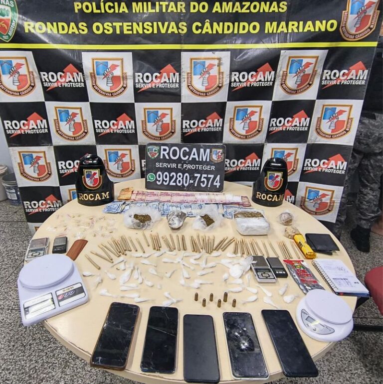 Durante a abordagem, foram apreendidos diversos materiais utilizados para comercialização e distribuição de drogas, incluindo balanças de precisão, dinheiro em espécie, porções de substâncias entorpecentes (maconha, cocaína, oxi e pasta base), além de dois simulacros de armas de fogo, seis munições e cinco celulares.