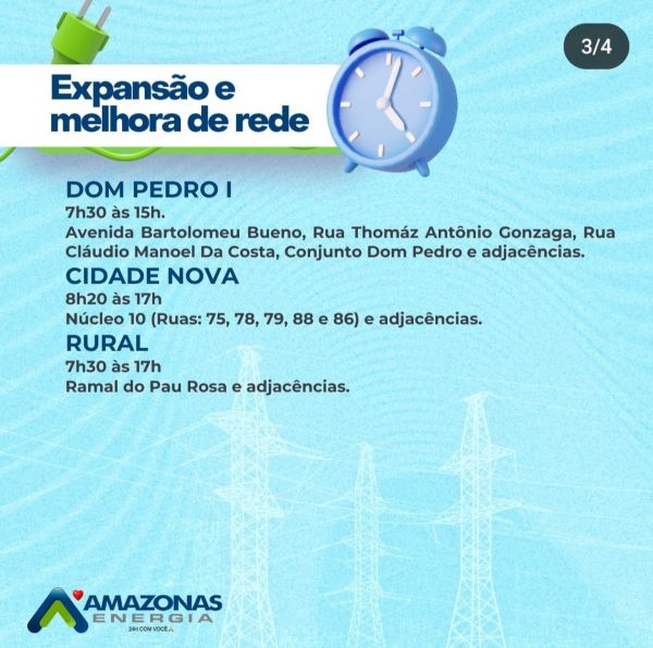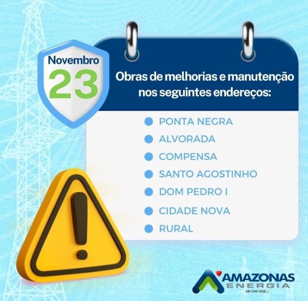Share Facebook Twitter LinkedIn Pinterest Email Publicidade Concessionária de energia recomenda que os moradores se preparem para o desligamento Seis bairros de Manaus e a zona rural ficarão sem energia elétrica neste sábado (23), devido a manutenções programadas na rede elétrica. Sete bairros de Manaus ficarão sem energia elétrica neste sábado (16); confira Destaques