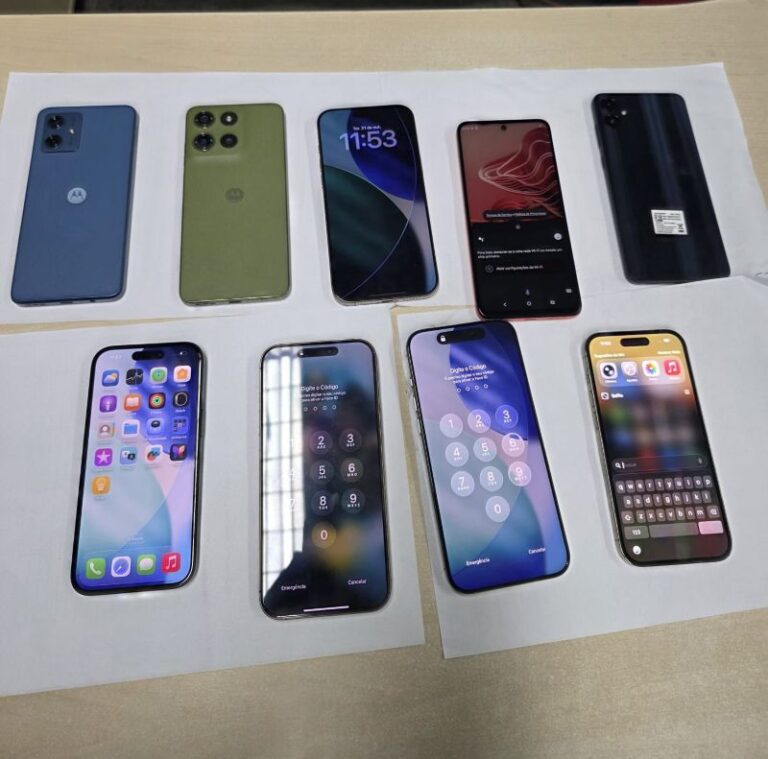 Na ação desta terça-feira, os agentes apreenderam cinco aparelhos celulares roubados — entre eles, dois iPhones 16 Pro Max, um iPhone 15 Pro e dois iPhones 14 Pro —, além de outros dispositivos bloqueados que serão encaminhados à perícia.
