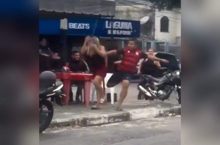 Nas imagens, a mulher aparece se aproximando do homem. Em seguida, ele reage com socos e chutes contra a vítima, que tenta se defender enquanto é atingida.