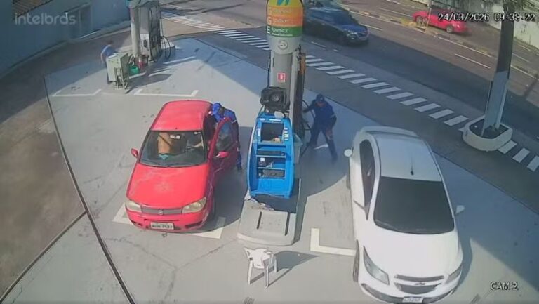 As imagens mostram a rotina normal do posto até o momento em que o frentista finaliza o abastecimento. Assim que o funcionário retira a mangueira e se vira para guardá-la na bomba, o condutor acelera o carro bruscamente e foge do local.