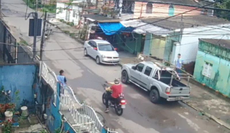 As imagens mostram que, por volta de 5h42, dois trabalhadores caminhavam pela rua quando um motociclista se aproximou. O suspeito parou o veículo, sacou uma arma de fogo e rendeu um deles, exigindo que entregasse o celular. O segundo trabalhador conseguiu correr e se esconder.